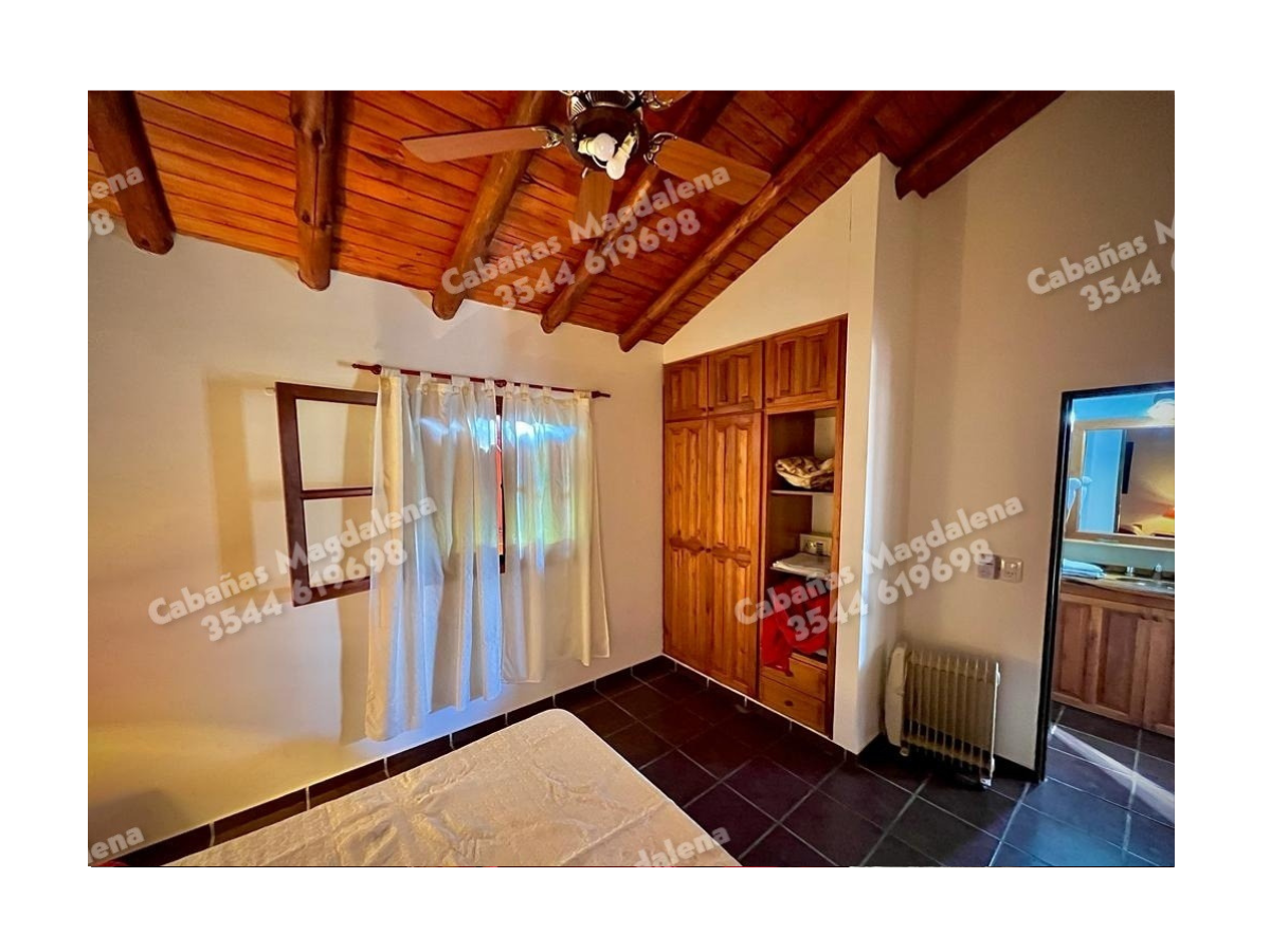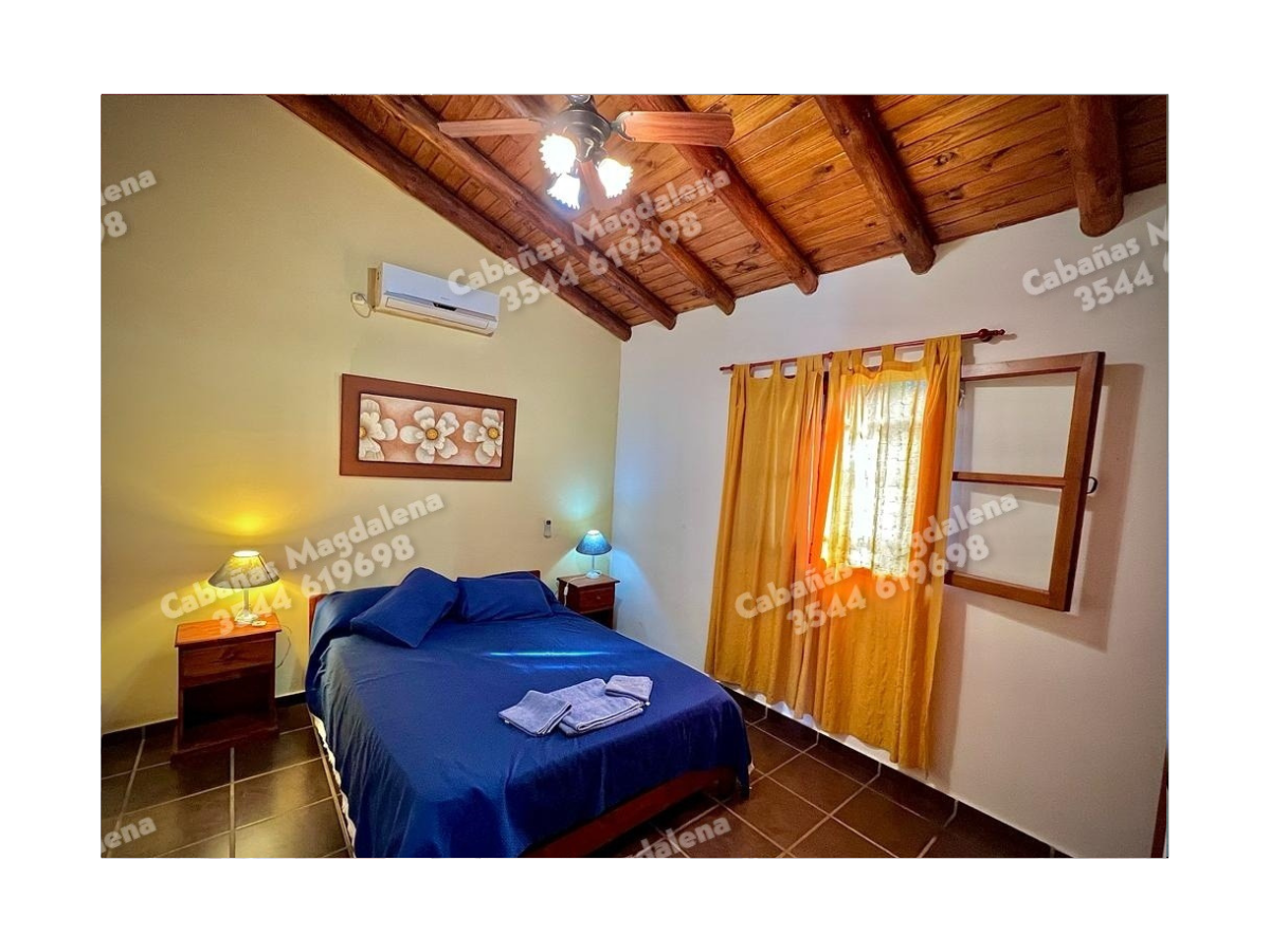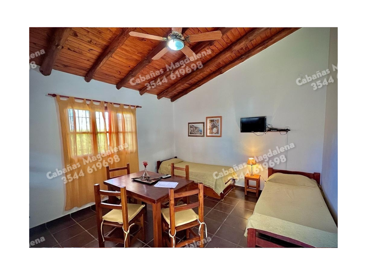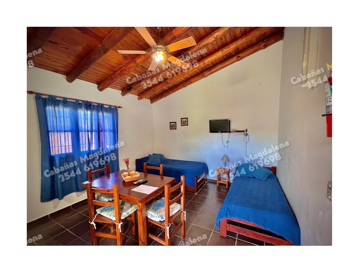 Contamos con tres unidades, una para 2/3 personas, dos para 4/5 personas, distribuidas en una habitación matrimonial y living con camas simples. Construcción de ladrillo y madera. A un paso del centro y río, amplio predio parquizado cerrado. Piscina Free pass (pase libre) en gimnasio Renacer.
