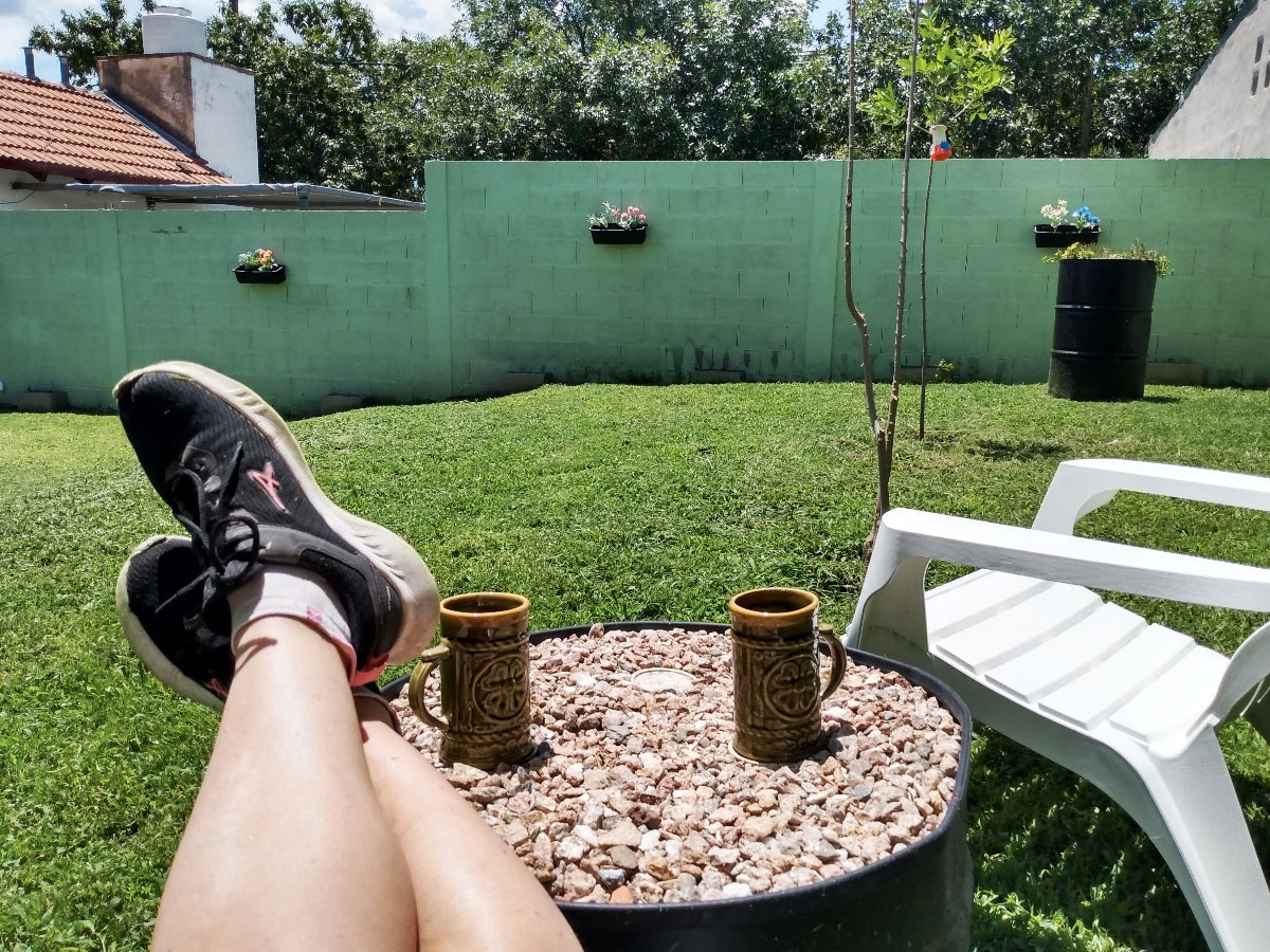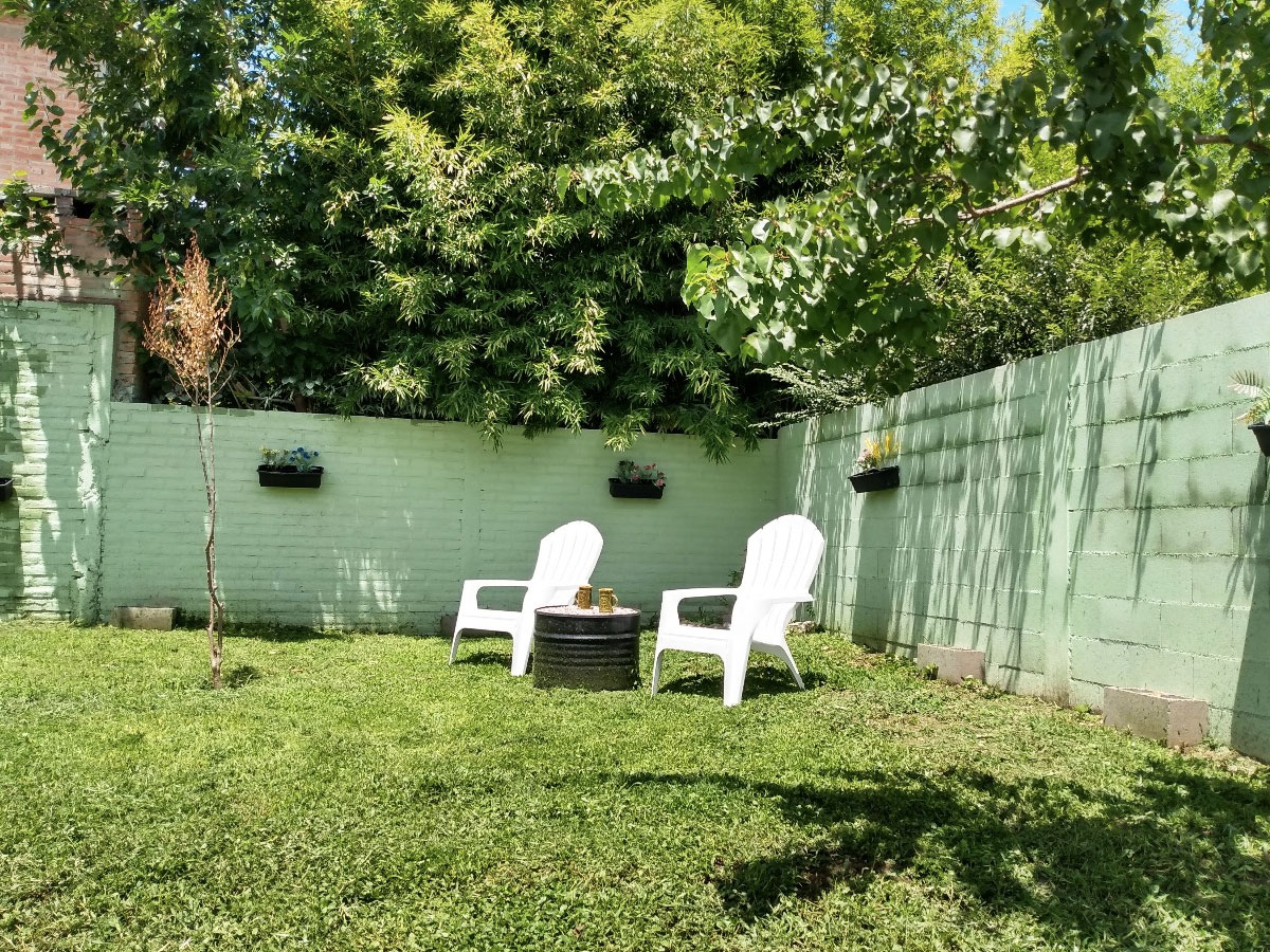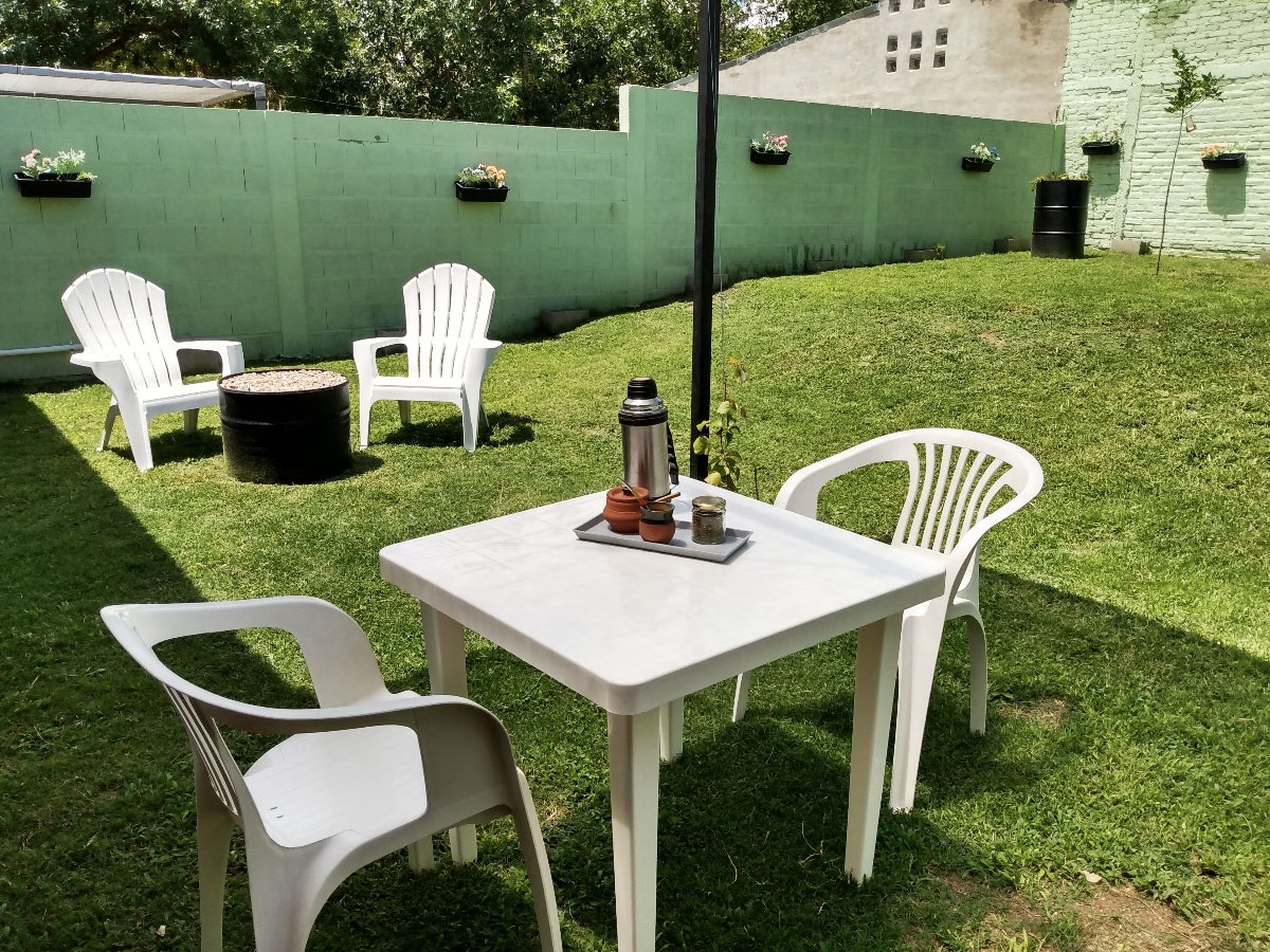 Un hermoso jardín con asador, pileta de lavar y tender.