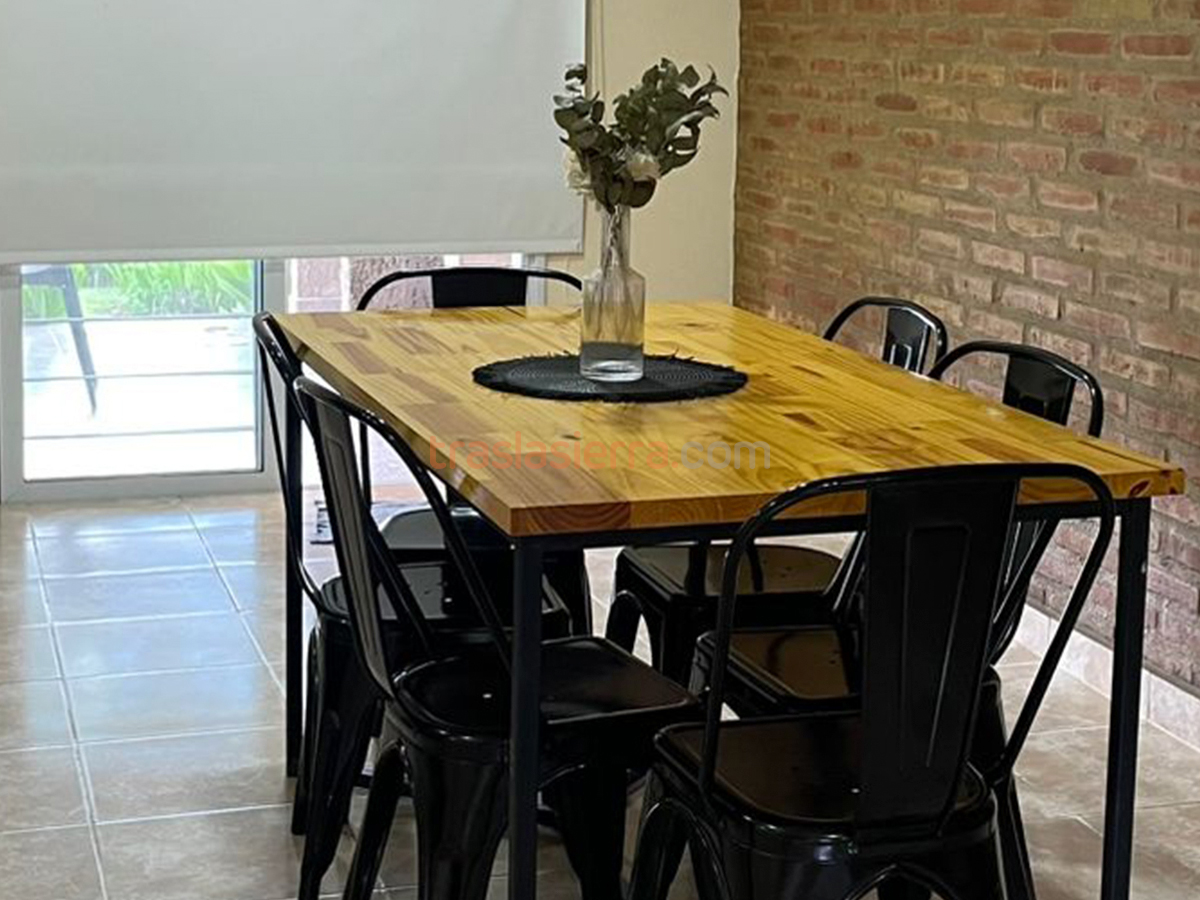 Cabaña de 3 ambientes, con 2 dormitorios, uno matrimonial, otro con camas simples y sofá cama en el living. Baño completo. Cocina living comedor totalmente equipado, cochera individual y galería semitechada con asador.