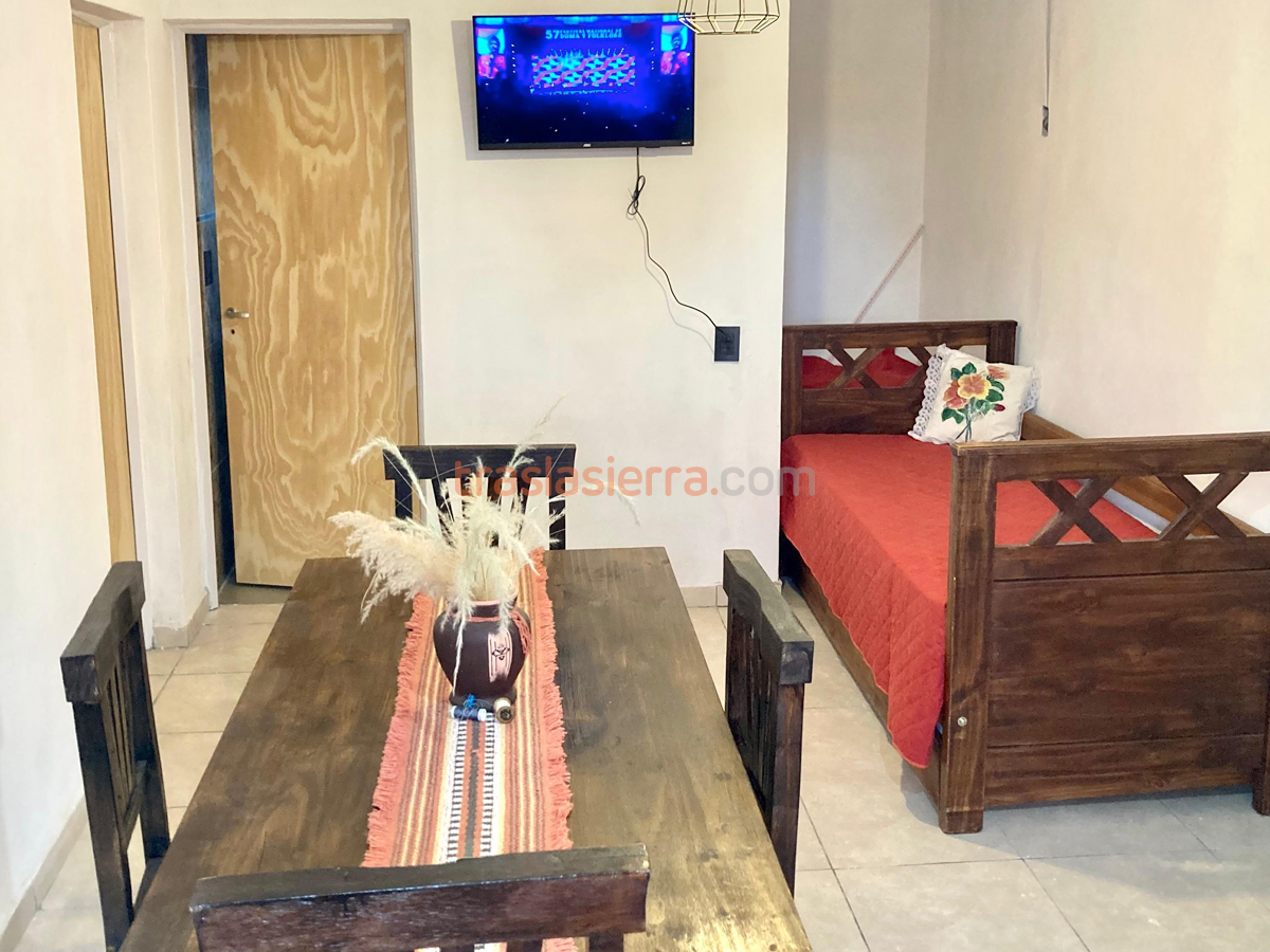 Dúplex para cuatro personas, uno en planta alta, con balcón, y otro en planta baja. Un dormitorio matrimonial amplio, una cama marinera en estar comedor, asador y parrilla individual.