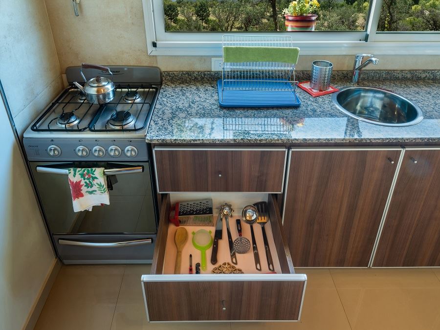 ![]() | Cocina | Equipadas con horno a gas, microondas, heladera con freezer, termotanque de alta recuperación, vajilla completa, tostadora y pava eléctrica. |