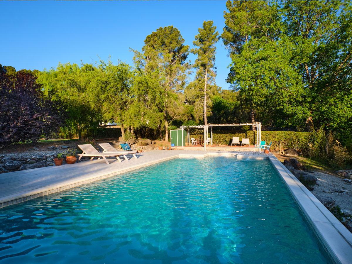 Alejada de las habitaciones y a unos pasos del arroyo Yacanto, se encuentra la piscina.
